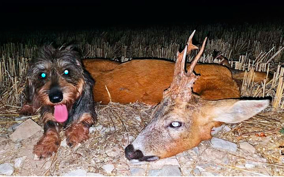 Jara junto al corzo tras encontrarlo después de un breve rastro.