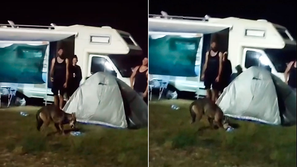 El lobo trata de abrir el plástico entre las caravanas en un primer momento. Finalmente, decide llevarse la comida a un lugar fuera del alcance de los ojos de los humanos para devorarla con tranquilidad.