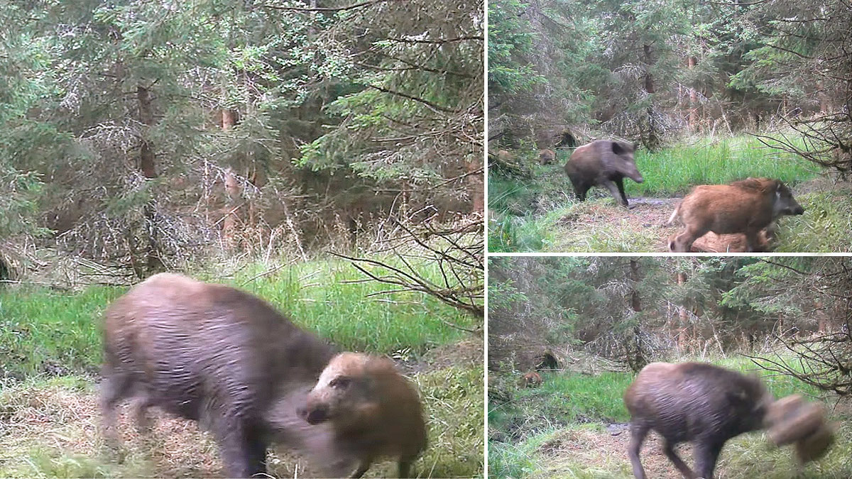 El cochino aparece súbitamente y corre hacia el comedero. Allí hay varios rayones y algún primalón, todas crías de jabalí de escasa edad que están descansando y comiendo justo frente a la cámara. Algo que no acepta el macho, que acude a toda prisa a dejárselo claro. Dos de los pequeños jabalíes consiguen escapar, pero el más pequeño, un rayón de pocas semanas de vida, estaba tumbado y tarda un segundo más que el resto en reaccionar. Un retardo que le lleva a centrar el ataque de su congénere, que con una embestida de su poderosa jeta lo lanza por el aire.