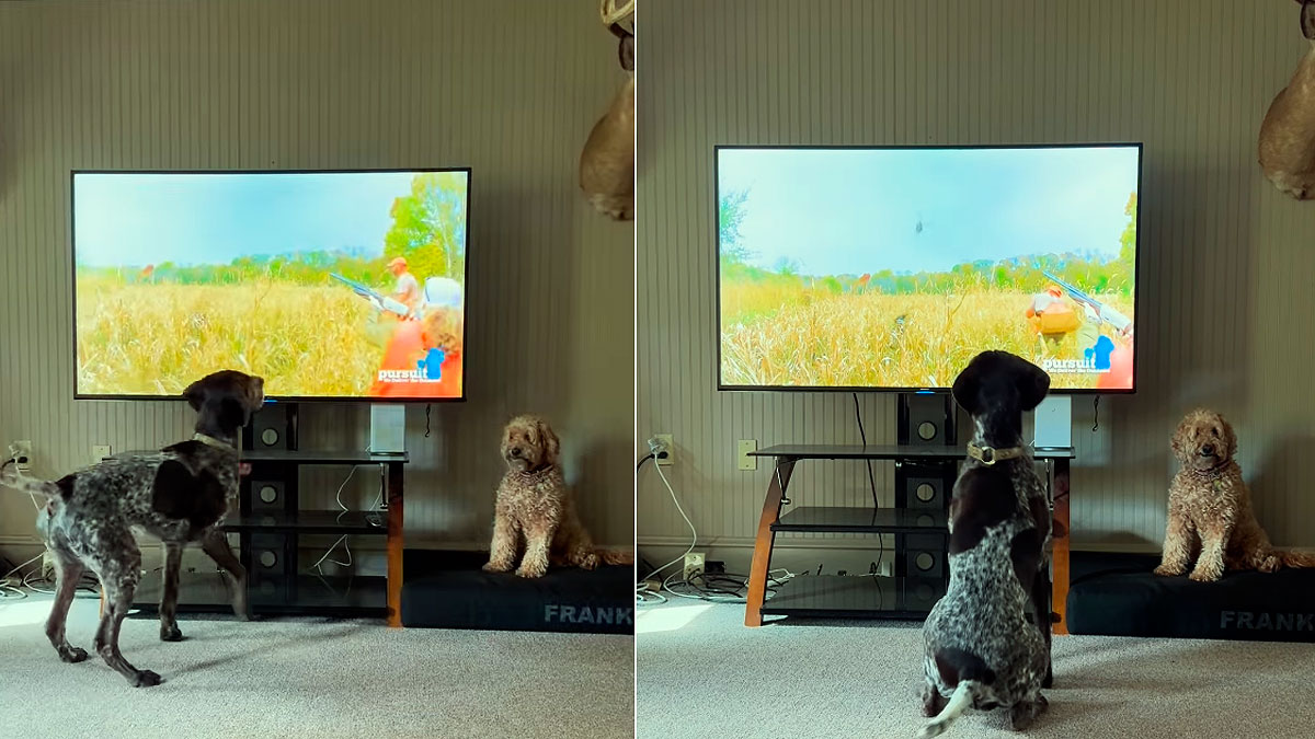 El braco alemán de pelo corto se acerca a la pantalla y toma asiento. Pero su emoción le impide permanecer quieto. Se levanta enseguida y se yergue sobre sus patas traseras en un intento de no perderse nada de lo que está aconteciendo en el vídeo. El faisán sale y la cazadora cumple con un disparo certero que da con él en el suelo. Una secuencia que le ha encantado a este perro mostrador, como destaca su propietaria en el comentario que acompaña al vídeo: “Creo que sobra decir que le encanta todo acerca de la caza de aves”.