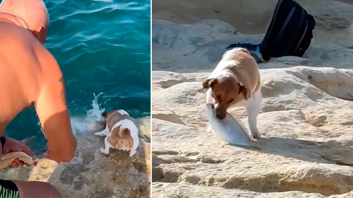 Un pequeño perro terrier consigue pescar un pez en la orilla del mar