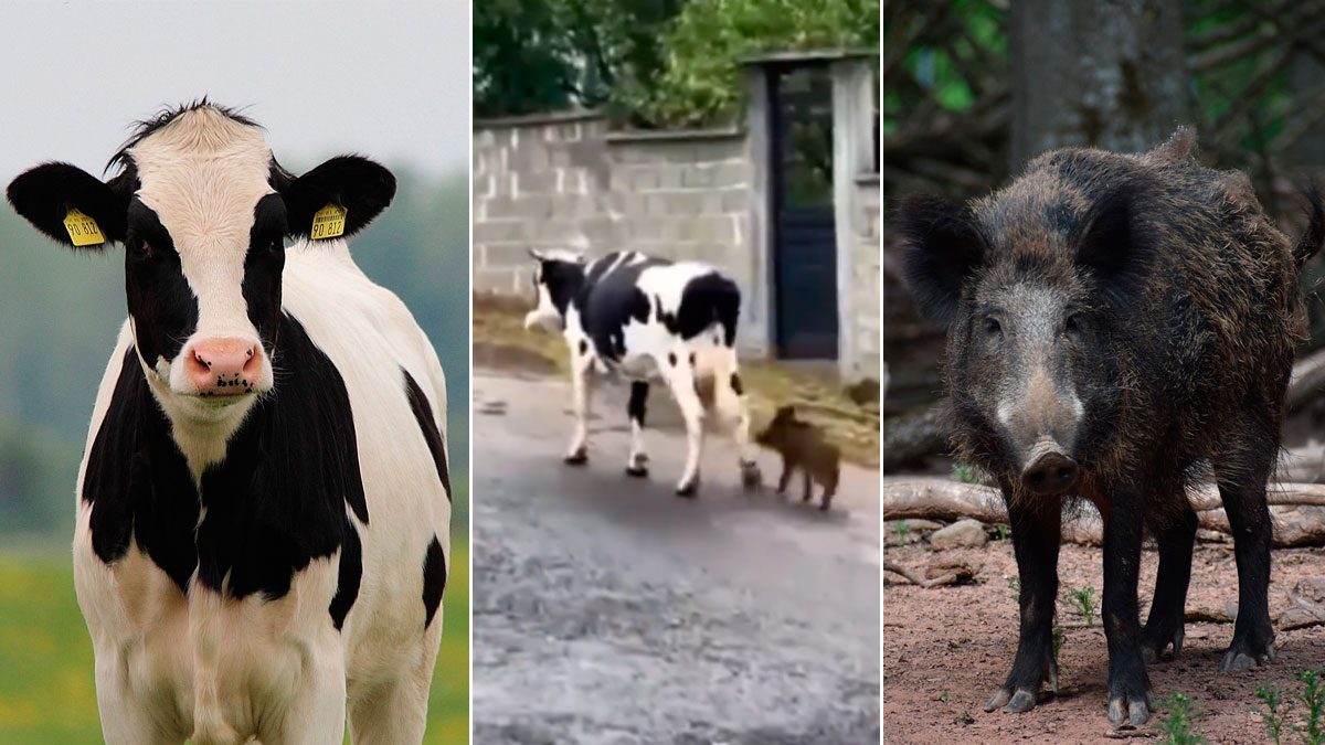 Son tantas las situaciones que han sido inmortalizadas en fotografías o vídeos, alguno de ellos tan insólitos como el de un jabalí intentando montar a una vaca. El celo que demuestra este animal rompe cualquier barrera entre especies, aprovechando que la vaca está tendida descansando para llevar a cabo sus extrañas pretensiones reproductivas.