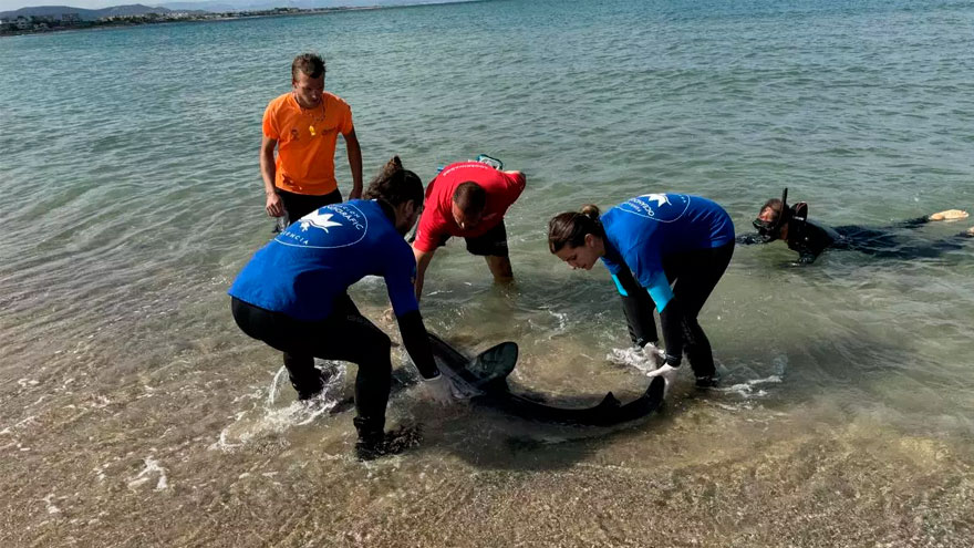 El cuerpo sin vida de una tintorera de dos metros de longitud fue hallado ayer en una playa de Dénia. A pesar de los intentos de rescate y de reintroducirla en el mar por parte del equipo de rescate de la Fundación Oceanogràfic, Salvamento Marítimo y Cruz Roja, el animal sufría importantes heridas en la zona de la cabeza y terminó por morir en la orilla.