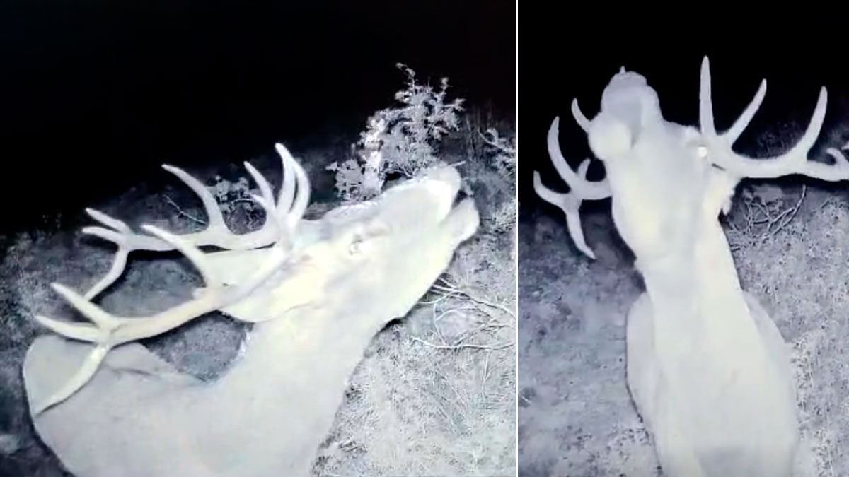 Como si quisiera dedicarnos su particular interpretación de la llamada encelada a las hembras, este ciervo se acerca a nuestra cámara de visión nocturna e, incluso mirando directamente a su objetivo, hace retumbar su voz en un potente berrido.