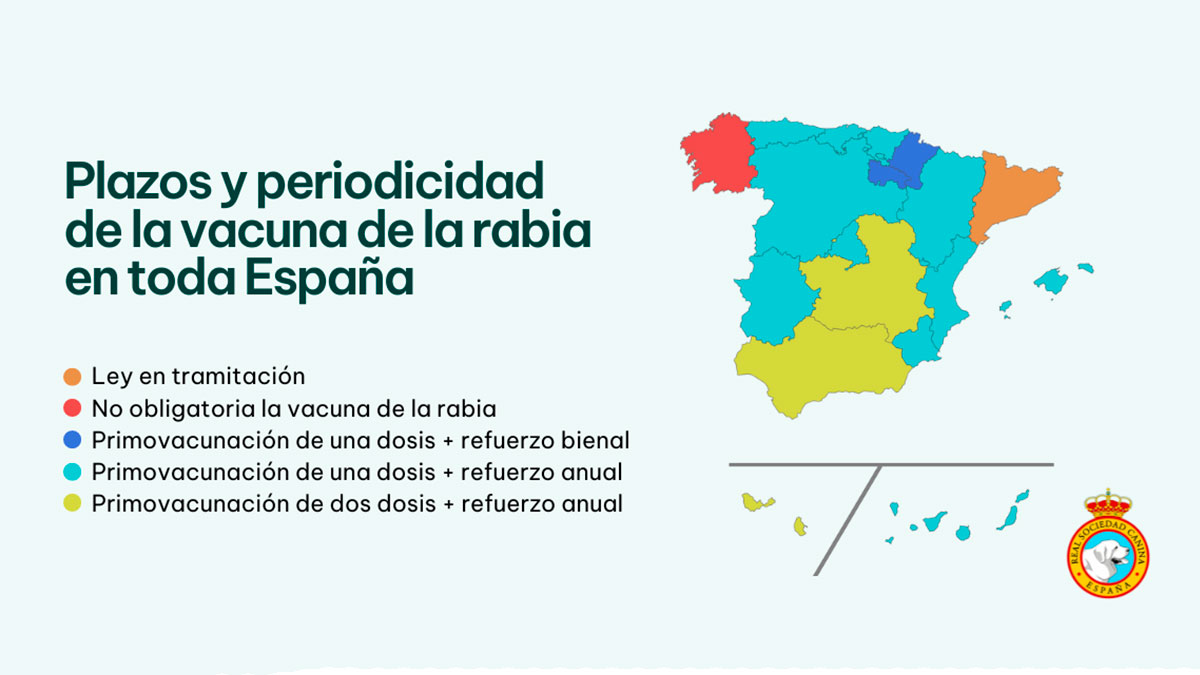 Actualmente, Galicia y Cataluña son las dos únicas comunidades autónomas donde no es obligatorio vacunar a los perros contra la rabia, si bien Cataluña está en trámites para la entrada en vigor este mismo año de un decreto que la declare obligatoria. En el resto de comunidades sí existen reglamentos, pero cada uno establece sus propios requisitos, existiendo una falta de plazos homologables y uniformidad que no favorece la erradicación de esta enfermedad.