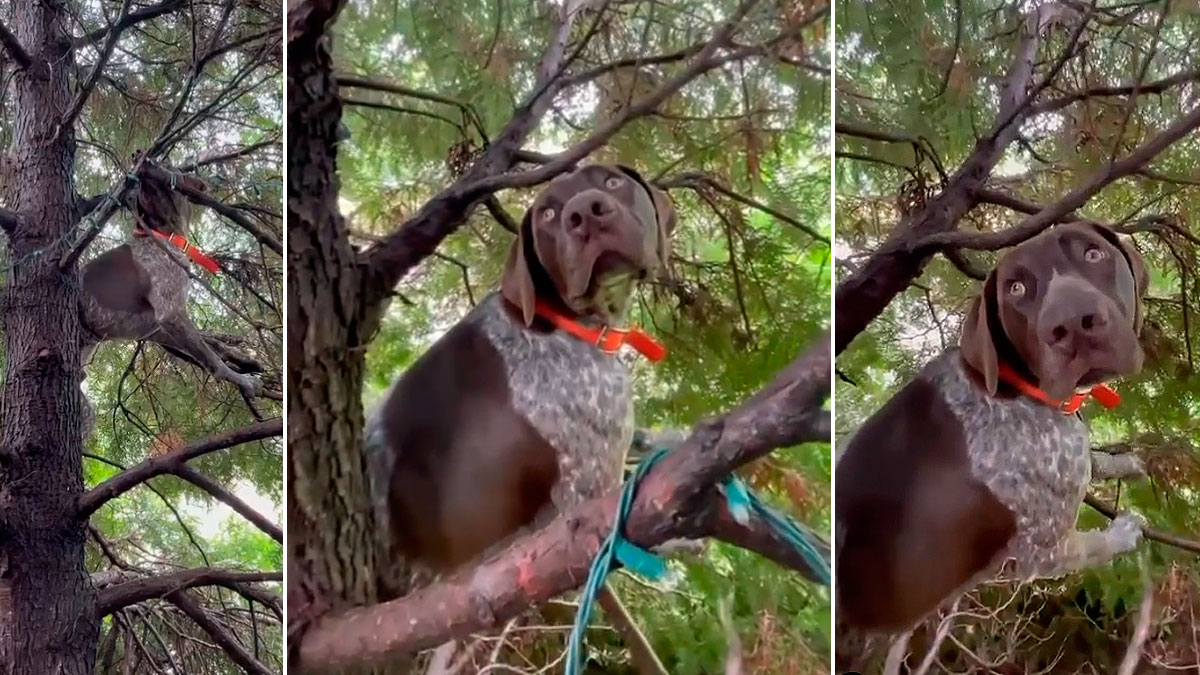 Un perro de caza muestra una pieza subido en las ramas de un árbol