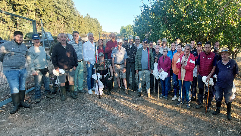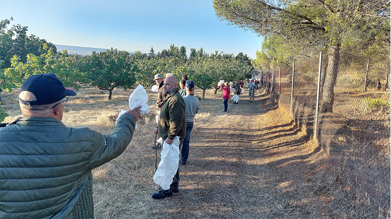 Se inicia el ojeo con la formación en línea del personal voluntario que, con la ayuda de unas varas, van batiendo el terreno para hacer saltar la liebre y conducirlas hacia donde las espera una red de captura.