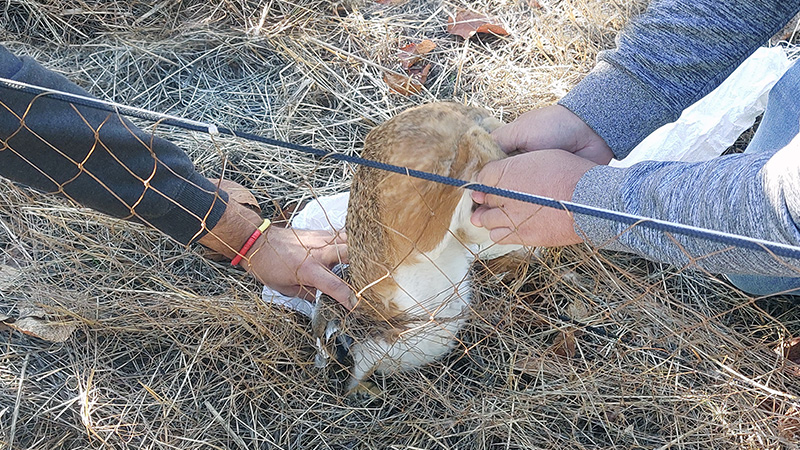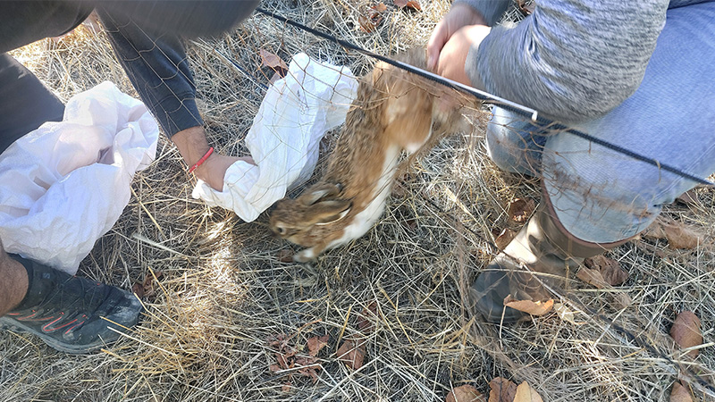 En la red hay personas esperando para desenredar la liebre, utilizando un saco para trasladarlas y evitar así estrés innecesario. Después se meten en una caja de cartón a la espera de su traslado a la mesa de trabajo