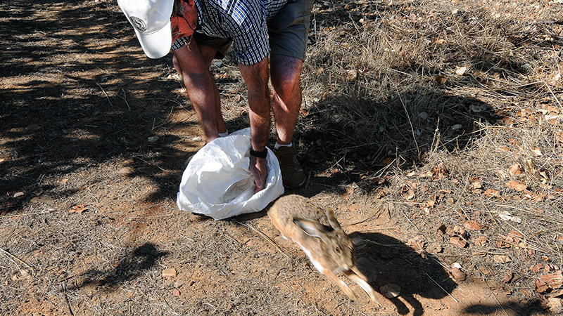 Liebre capturada que se guarda cuidadosamente en el saco.