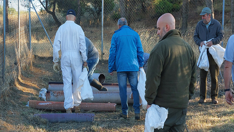 Algunas liebres evitan caer en la red y se va a los perdederos escondiéndose en tubos colocados al efecto de donde son capturadas y metidas en el saco.