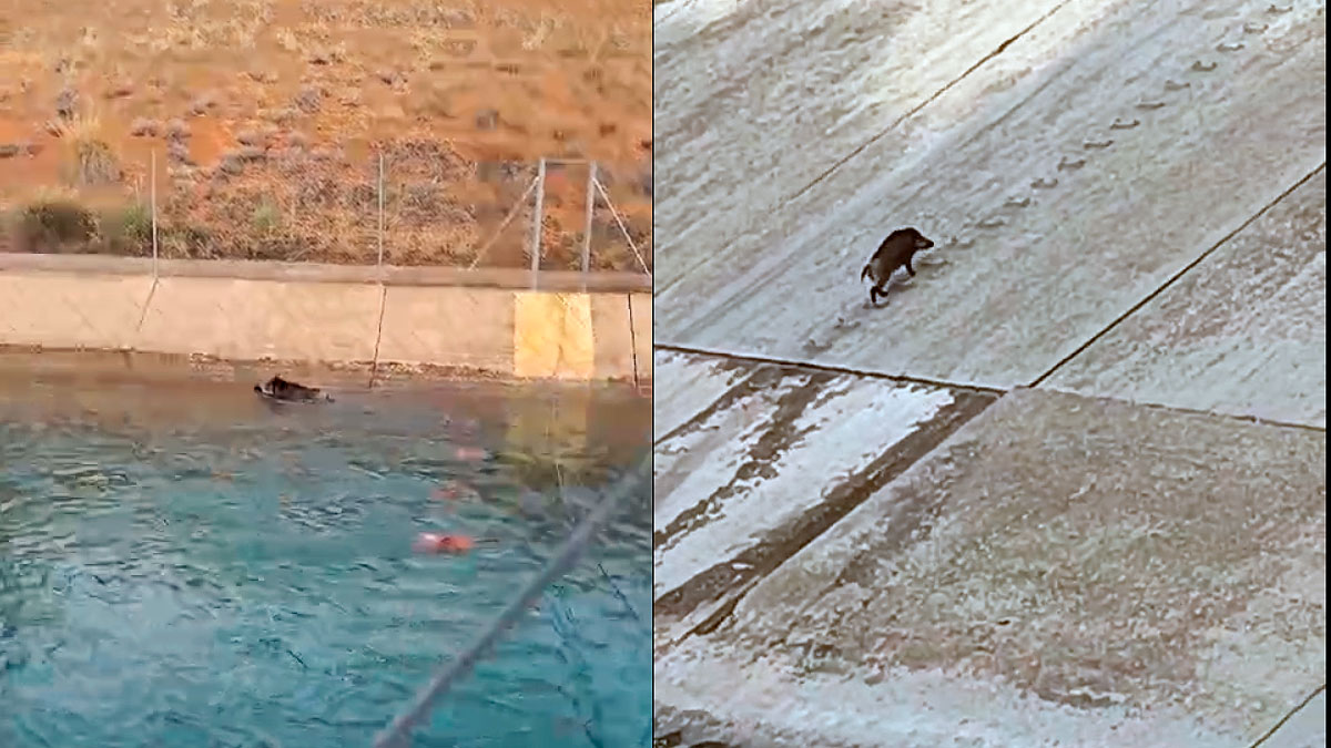 Un jabalí con enormes colmillos, atrapado en un canal de agua. ¿Intentarías ayudarlo?