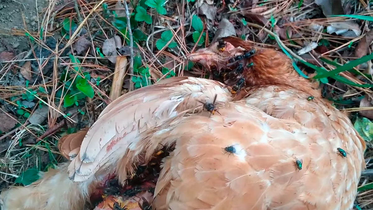 Tras examinar el ejemplar el especialista comprobó que el pájaro presentaba heridas fruto de picotazos de otras aves de corral. Según el experto, «los insectos, atraídos por el olor de la sangre, intentaron alimentarse de la gallina. Las picaduras de las avispas acabaron con la vida del pájaro al tratar de impedirlo».