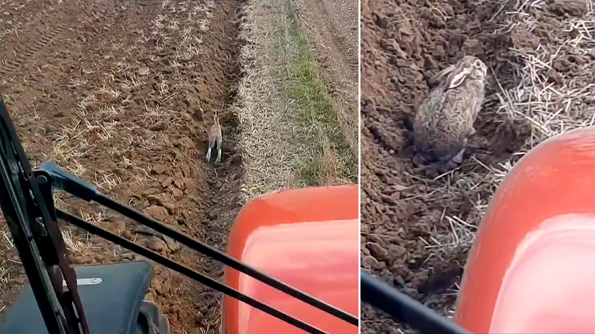 La liebre utiliza los surcos y las depresiones en el terreno para avanzar de manera casi invisible para los depredadores terrestres. Una estrategia de escape en campo abierto que también llevan a cabo en zonas donde la hierba o los cultivos pueden ocultar su figura. Pero eso no explica que este ejemplar no haga uso de su velocidad, superior a los 70 kilómetros a la hora, que dejaría atrás enseguida al enorme y lento vehículo agrícola.