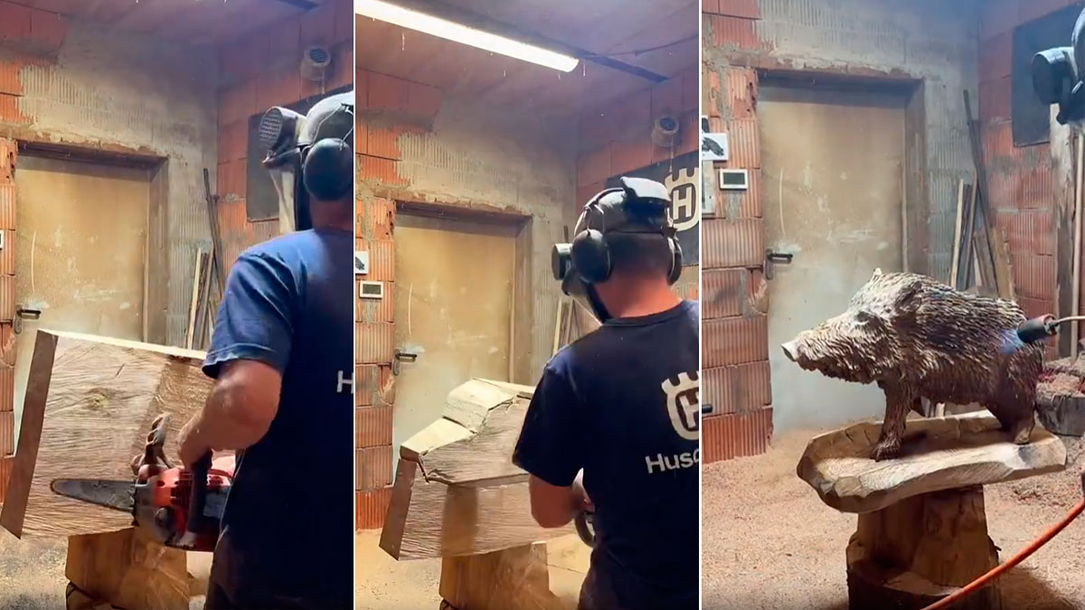 En esta ocasión, nos detenemos en un vídeo que nos enseña, de manera acelerada, cómo trabaja un gran tocón de madera desde cero hasta concluir la escena en la que plasma un jabalí con todo lujo de detalles. Resulta sorprendente cómo consigue reproducir la textura del denso pelaje que cubre a estos animales blandiendo su motosierra y trabajando la madera como si se tratase de un leve cincel.