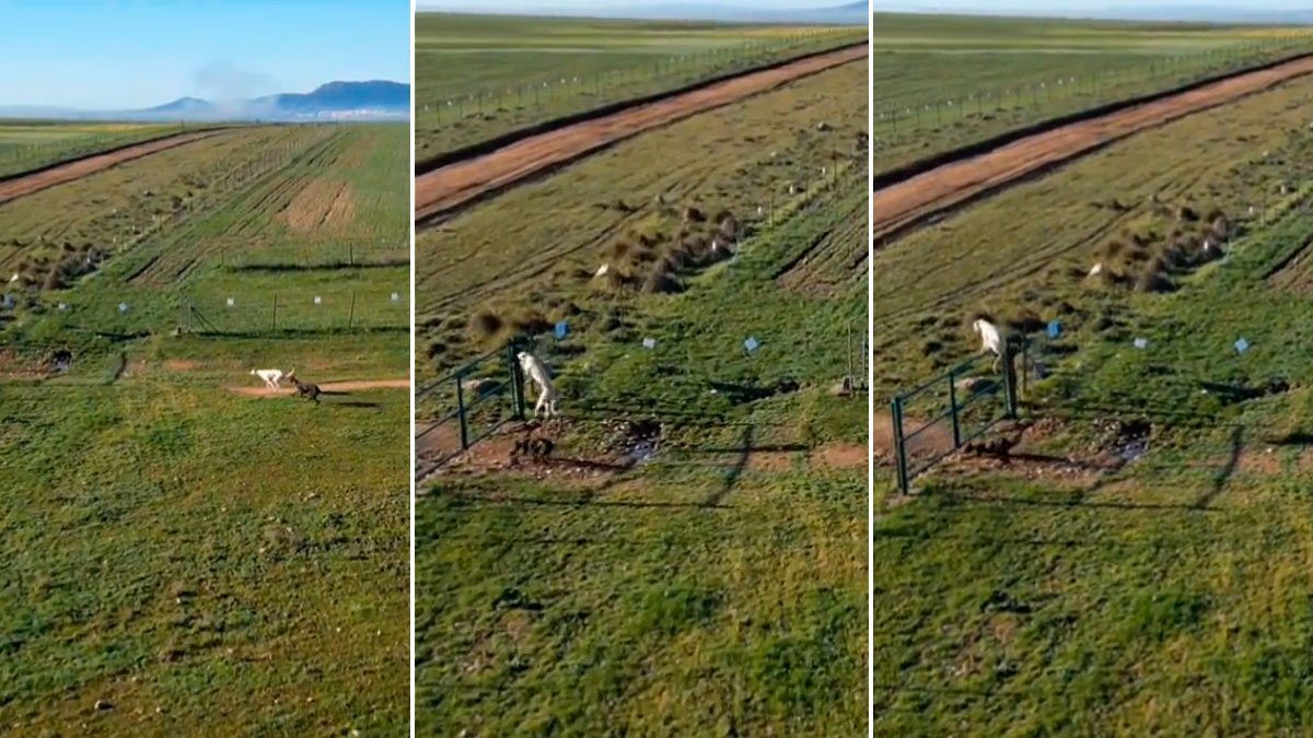 Una vez han superado la valla, la liebre y los galgos miden sus fuerzas en una improvisada pista de carreras. La orejona elige como ruta de huida un carril de tierra. La carrera dura más de dos minutos.