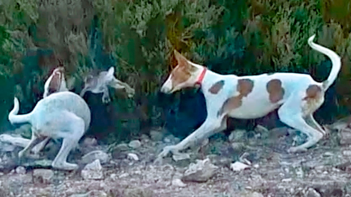 En escasos segundos, los perros levantan y atrapan al conejo.