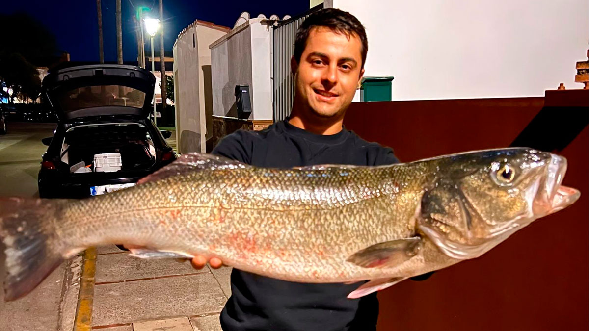Alejandro junto a la enorme lubina pescada em pasado sábado.