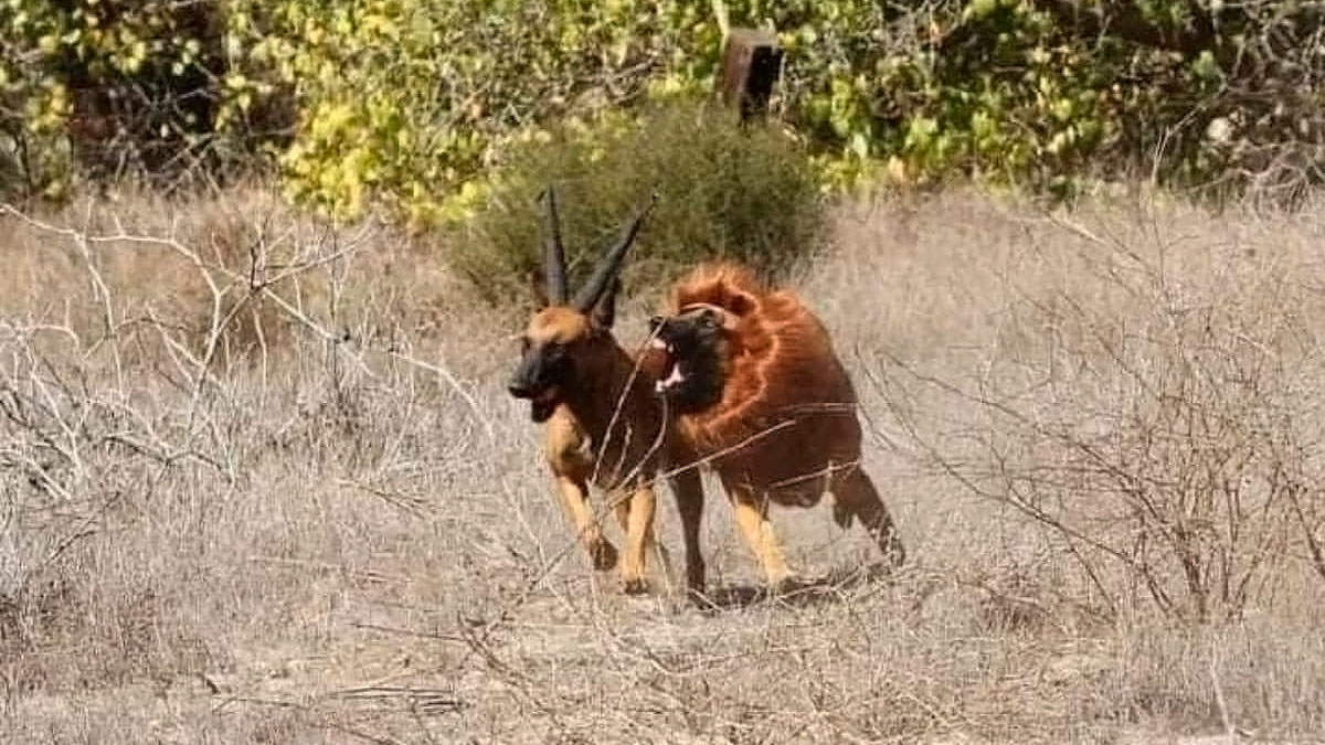 El pelo que cubre el manto y el color de ambos perros los convierten en los actores perfectos para interpretar a dos de los animales que más veces se miden en la batalla por la vida y la muerte en el continente africano. Un león macho, con una imponente melena y una gacela con cuernos rectos y largos. A continuación, solo tiene que lanzar una pelota para que la coja la gacela y esperar que comienza una disputa sana para jugar con ella.
