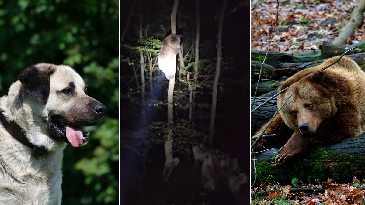 Un kangal turco puede alcanzar un peso de hasta 65 kilos en edad adulta. Con una altura a la cruz máxima de 81 centímetros, encarna una de las razas caninas de mayor envergadura y potencia. En estas imágenes vemos a siete ejemplares y otro perro amastinado de similar tamaño que centran sus sentidos en el animal que ha conseguido subir unos pocos metros para escapar de sus poderosos perseguidores. Se trata de un ejemplar joven de oso pardo, quizás en la subespecie de siria, presente en los bosques de Turquía y cuyo peso, dependiendo de su edad y de si es macho o hembra, puede oscilar entre 100 y 250 kilos.