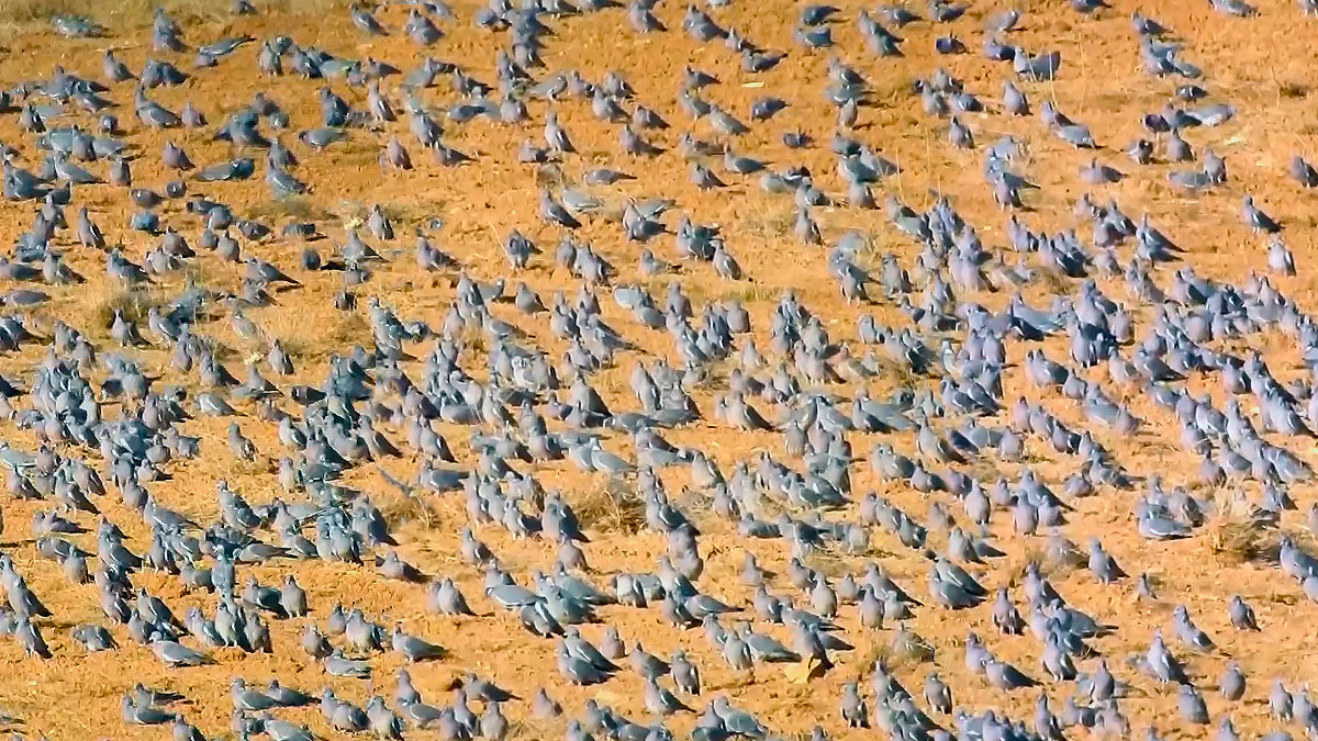 La cámara escanea el terreno en el que se han posado las aves y prácticamente cubren la totalidad del suelo. Y aún hay ejemplares que siguen tomando tierra, mientras otros ya rebuscan