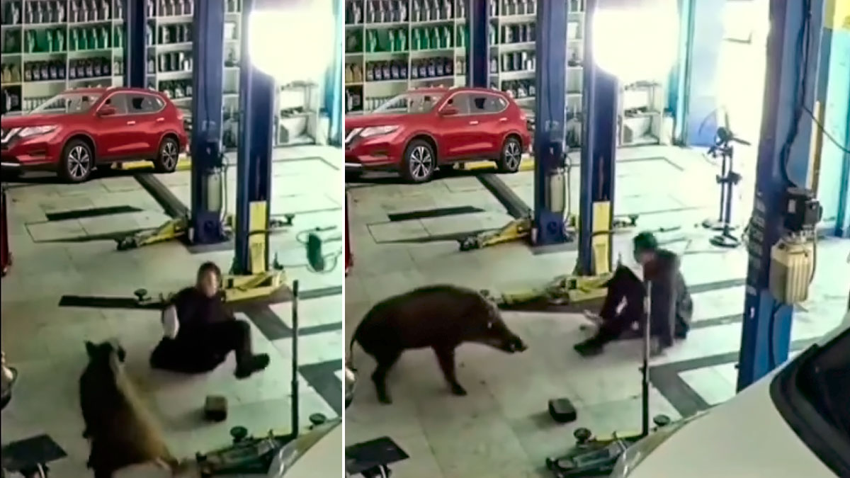 La cámara de seguridad recoge el instante en el que el mecánico ya se encuentra tirado en el suelo y el jabalí intenta echársele encima para atacarle violentamente. Son momentos de mucho peligro en el que los poderosos dientes del animal y los colmillos que sobresalen de su boca pueden ocasionar heridas muy graves en el cuerpo del hombre.