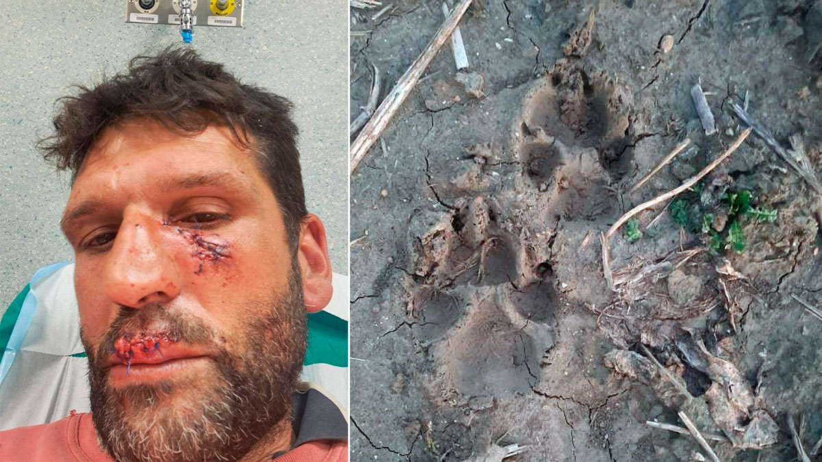 Al acercarse, comprobó el tipo de peligro que acosaba a los suidos, ya que dos lobos llegaron y le rodearon. Uno de ellos no tardó en lanzarse sobre el rayón. Lo atrapó en un instante. Él estaba paralizado por la cercanía de los depredadores, y casi no pudo reaccionar cuando el segundo lobo se abalanzó para empezar a morderle, a pesar de que tenía en la mano el cuchillo que estaba usando para abrir los envases de los productos fitosanitarios. El animal le mordió en el pómulo, el labio y en uno de sus brazos a pesar de que golpeó la cabeza del depredador con su puño en repetidas ocasiones.
