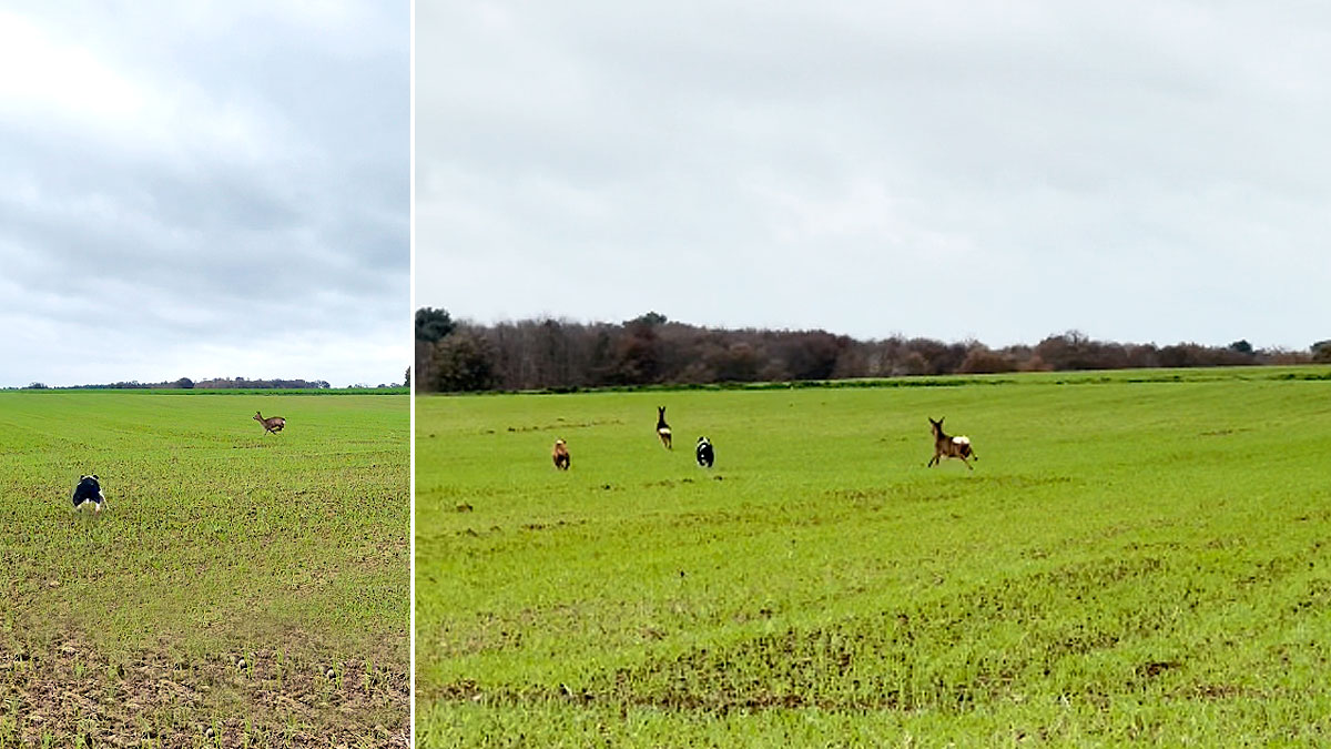 Un perro comienza a correr a toda velocidad. El motivo lo vemos enseguida: hay un corzo muy cerca y ha activado su instinto de persecución y caza. Enseguida otro can se suma a la persecución y, un segundo después vemos otro corzo corriendo tras ellos. Todo sucede sobre un terreno cultivado, lo que ha llevado a muchos a recriminar que esos canes, de tipo bull o de presa, estuvieran libres de las respectivas correas. Porque, a pesar de que la dueña los llama a gritos, estos no hacen caso, porque sus sentidos están centrados en la presa que huye delante de ellos. Es posible que ni la escuchen.
