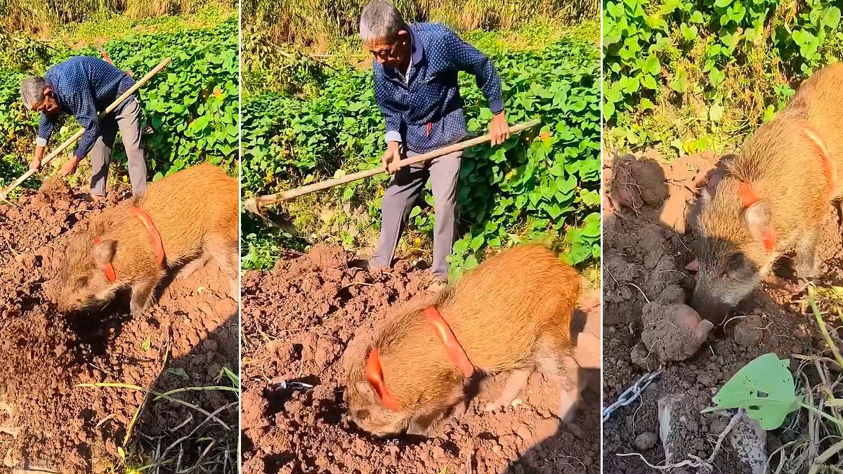 Puede parecer una locura, pero este agricultor asiático ha optimizado las cualidades del jabalí para desenterrar frutos o hortalizas como estas batatas con su eficacia hozando. No le hace falta la azada que maneja su propietario y con la que está llevando a la superficie de esta tierra labrada las batatas ya listas para recoger. El suido utiliza su dura jeta para encontrarlas y desenterrarlas, algo que la especie lleva haciendo muchos siglos para conseguir alimento y que parece que le sirve de gran ayuda al veterano agricultor que trabaja a su lado.