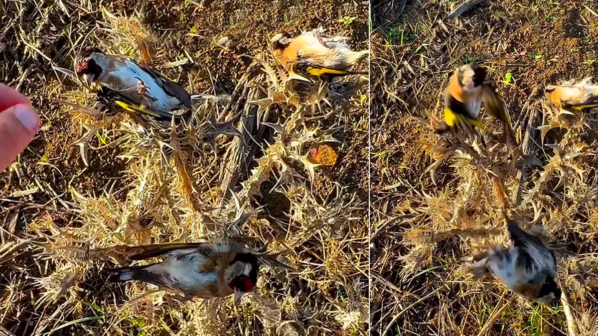 Lo realmente sorprendente es que hay gente que cree que estos jilgueros están ‘tomando una siesta’ o incluso que han quedado atrapados, los tres, en posiciones similares y en un cardo, que es una planta que ha desarrollado múltiples espinas para protegerse de algunos animales.