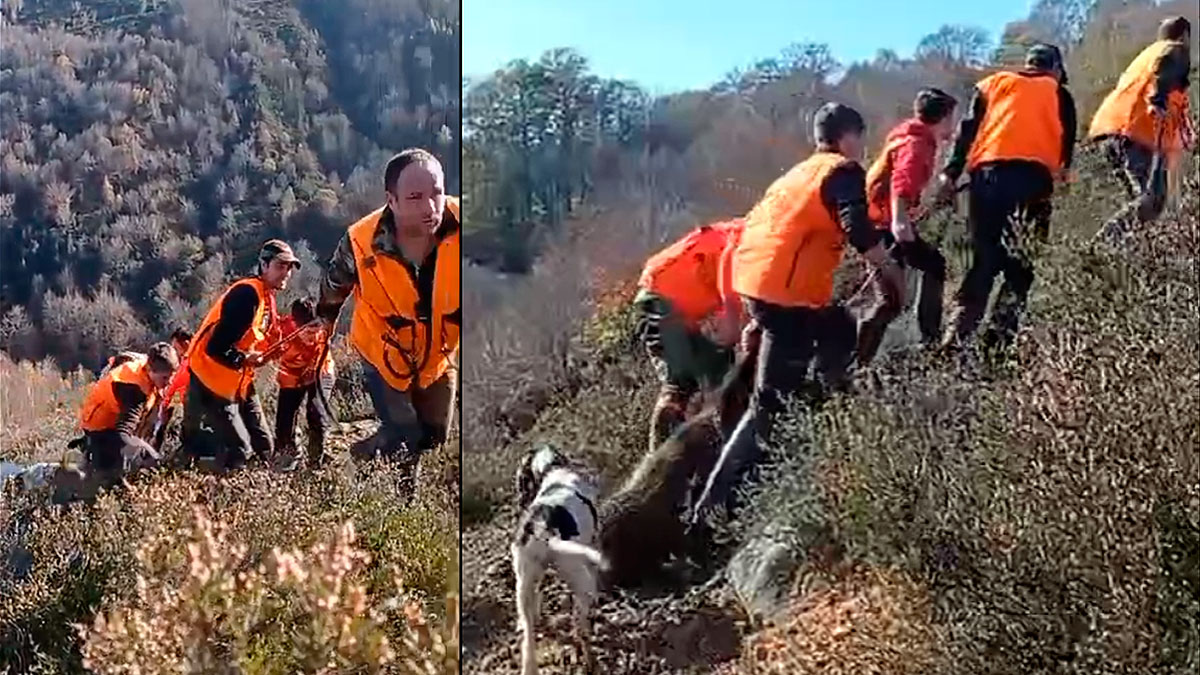 Esta es otra de las conclusiones del estudio publicado por la RFEC. Los más jóvenes de la cuadrilla El Costal del norte de Burgos ayudan a los más veteranos a llevar una cochina de 60 kilos al lugar de aparcamiento de los vehículos. Los cazadores que arrastran la jabalina son Azkona, Alberto, Oliver, Lucas, José Antonio y Toñete.