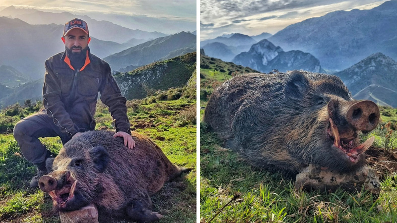 Inexplicablemente el macho recorrió gran parte de la mancha de robles, castaños y avellanos sin recibir disparo alguno. Cuando ya iba a eludir el cerco, lo localizó David dirigiéndose hacia una cárcava en la que no había ningún montero situado. La experiencia del cazador en la caza del jabalí posibilitó al asturiano frenar su huida con dos disparos de su rifle de cerrojo Tikka del calibre .308Win.