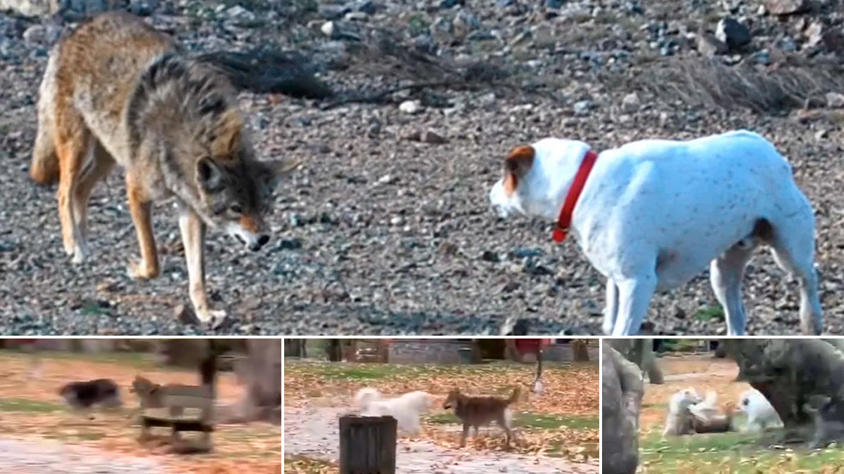 Los perros se mantienen unidos después de que uno de ellos se viera sorprendido por el ataque traicionero del coyote. Estos canes parece que están acostumbrados a plantar cara a este tipo de amenaza, sobre todo un gran mastín de color blanco, que llega a derribar al depredador y esto supone que este decide desistir de intentar conseguir a su presa y huir de allí a toda velocidad.