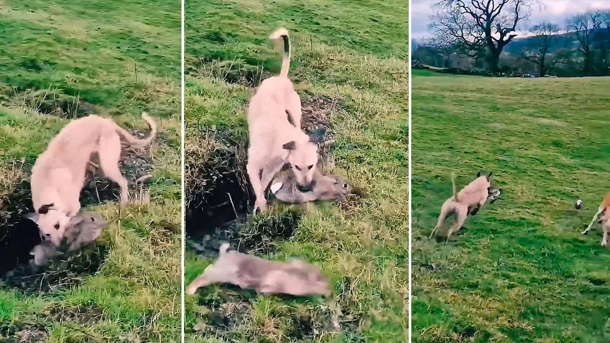 La cuenta de Instagram Wild Animal Nature se hace eco de este espectacular lance. Los galgos esperan la salida de los conejos de las huras situadas en un prado. Han sido adiestrados para cazar con la ayuda de hurones. Al primer ejemplar desalojado por los mustélidos no le da tiempo a emprender la carrera y es atrapado nada más abandonar el agujero. Segundos después escapa de la madriguera otro conejo. El animal emprende una veloz huida para intentar escapar de los canes.
