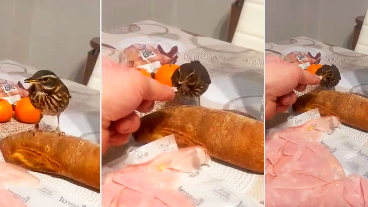 Este precioso zorzal, perteneciente a la especie de los alirrojos, es, como sus congéneres, un animal omnívoro al que le encanta alimentarse de una numerosa lista de invertebrados, sobre todo lombrices y caracoles, insectos, así como frutas blandas y bayas, lentiscos, aceitunas… Pero esto se aplica a los ejemplares que nacen y viven en libertad. El pájaro que vemos subido a la mesa donde su ‘propietario’ está comiendo ha sido criado o acostumbrado a la vida en cautividad. Está muy familiarizado con la persona que retira el plástico protector al embutido y le ofrece un pedazo, que no rechaza, al contrario, lo engulle con un inusitado entusiasmo.