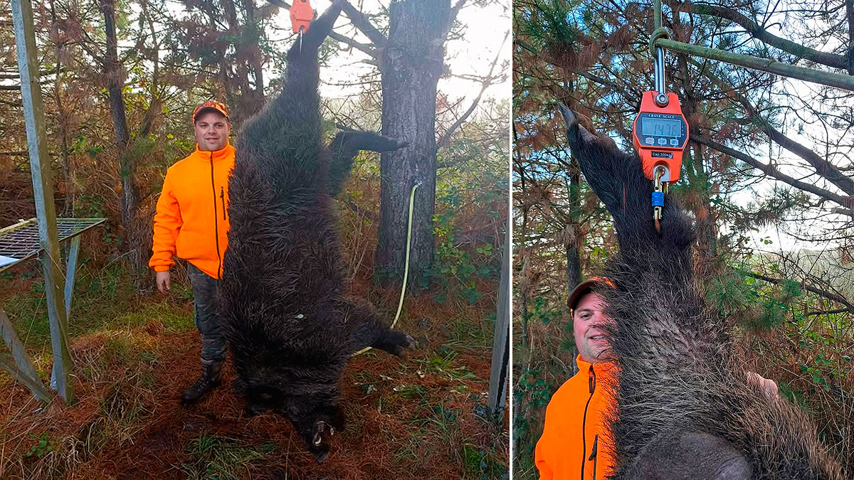 Y así fue, como nos cuenta Aitor: “Lo sentía romper por el monte hasta que por fin pude verlo. Encaré mi rifle, un Browning en calibre 9,3×62 y coloqué la bala en un lateral del cuerpo del jabalí”.  Un disparo certero que detuvo la carrera de este vakamulo, el de mayores dimensiones que ha conseguido derribar el gallego y que, según nos confiesa, le produjo una alegría enorme al acercarse y comprobar, no solo el tamaño, nada menos que 147 kilos pesados en la báscula, sino las dimensiones del trofeo: “Lo he llevado a un compañero que es el que hace los trofeos de jabalí y me ha dicho con solo verlo que es medalla de bronce seguro y que daría algo más si no tuviera un colmillo partido, seguramente por pelear con otros machos”.