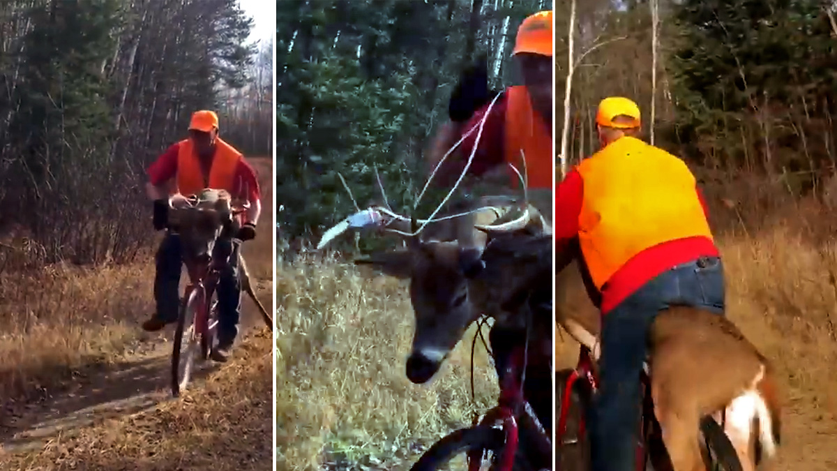 Un recechista sorprende a sus compañeros de caza al transportar el venado que acaba de abatir sobre el cuadro de una bicicleta. Un macho de esta especie de cérvido puede alcanzar los 160 kilos de peso.