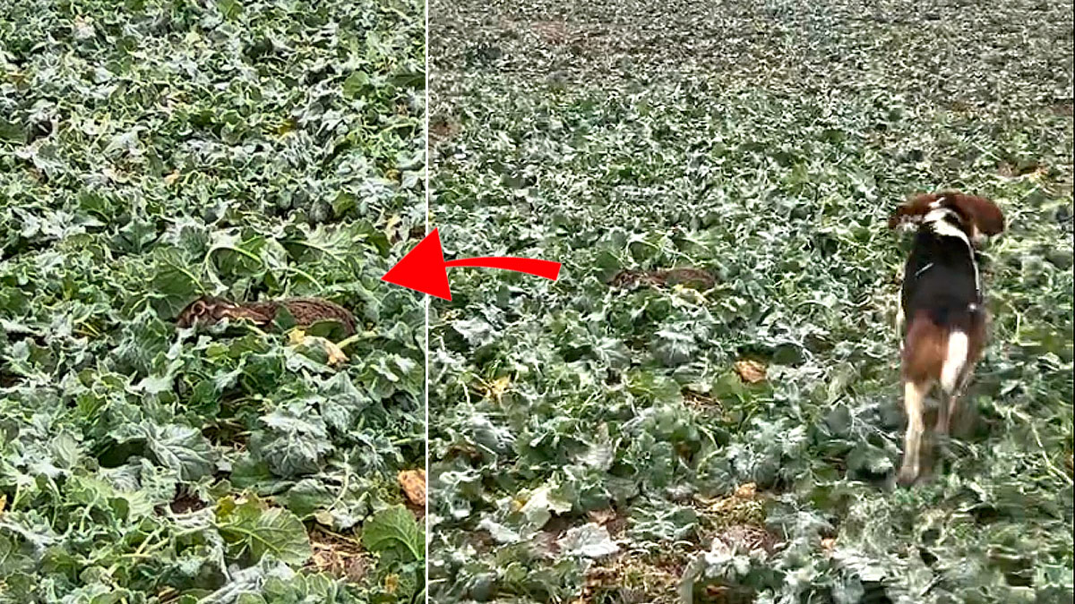 Un segundo vídeo grabado por el mismo cazador nos enseña el desenlace de esta tensa escena. La insistencia del propietario del can, que le anima a seguir buscando en esa zona lleva al can a seguir aproximándose al encame. Esto llega a la liebre a decidir que ya ha sido suficiente presión y deja atrás su estrategia basada en el camuflaje y hace uso de otra de sus grandes bazas para huir de los depredadores y perros de caza: su velocidad. No en vano, es capaz de recorrer cien metros en menos de 5 segundos, alcanzando velocidades punta de más de 70 kilómetros por hora.