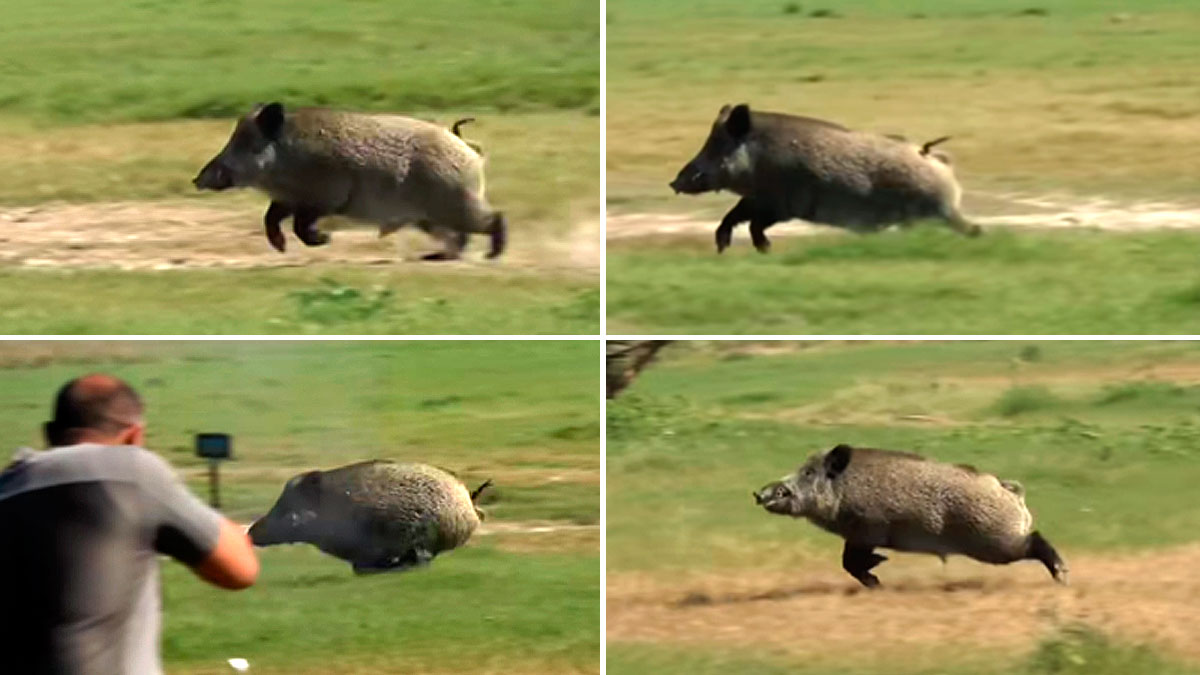 Suenan dos disparos sin que el macareno parezca acusarlos. Su inmenso cuerpo no da muestras de encajar los impactos de las balas del turco. Afortunadamente, tenemos una toma a cámara lenta que nos permite comprobar que alguno de esos disparos sí ha alcanzado su objetivo, aunque no en una zona vital. Cuando suena la tercera detonación, colocada delante del codillo del jabalí, este acaba cayendo al suelo.