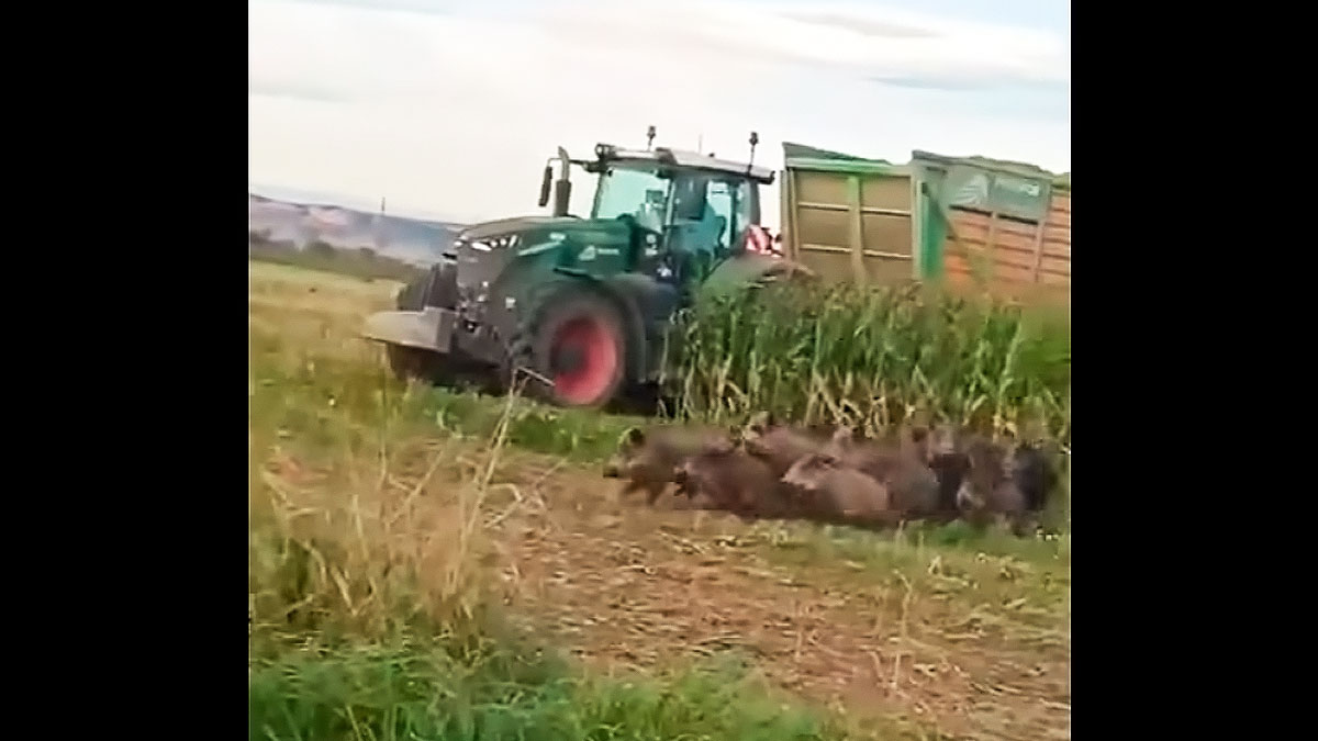 Un cazador, pescador y ganadero navarro publica en su perfil de Facebook, con más de 20.000 seguidores, un vídeo realizado en la Comunidad Foral de Navarra. En él podemos ver cómo dos cazadores detienen su vehículo para observar los animales que se esconden en la última porción sin recolectar de una siembra de maíz. La persona que guía la cosechadora hace sonar el claxon de la máquina para obligar a los ejemplares que se encuentran entre el maíz a abandonar el cultivo. Intenta por todos los medios no atropellar a la enorme piara de cochinos que se resiste a salir del maizal. Aunque el primero en salir es un avispado zorro.