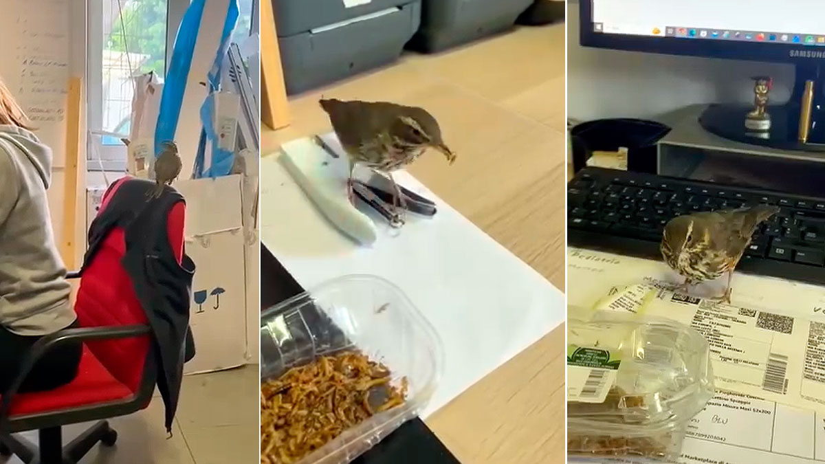 Un zorzal alirrojo comparte la jornada de trabajo de los administrativos de una empresa de alimento para aves. Los empleados ofrecen gusanos al pájaro a la hora del desayuno.