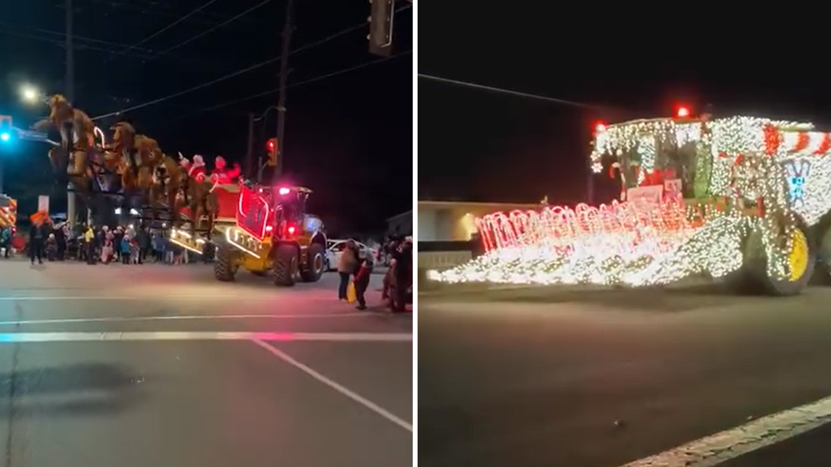 El propietario de esta máquina agrícola fue grabado mientras se dirigía a un desfile navideño. Las imágenes publicadas por La Sotizerie en su página de Facebook son de gran belleza. Al vehículo destinado para la recolección de las cosechas no le falta un detalle. Tanto las cuchillas como el resto de la máquina están totalmente cubiertas con motivos navideños.