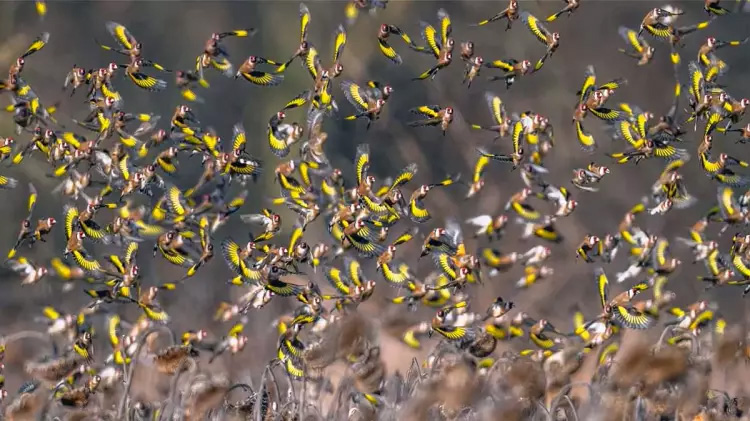 El trabajo del fotógrafo polaco de vida silvestre Mateusz Piesiak ha encandilado a todo aquel que ha visto el resultado de una jornada de esperas en un campo de girasoles. El propio profesional ha reconocido que los pájaros formaban “la bandada de jilgueros más grande que jamás haya visto”. Esto le permitió encuadrar y enfocar a estas preciosas aves e inmortalizar su vuelo y editar un precioso vídeo del mágico momento.