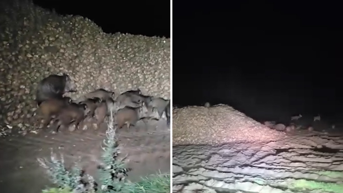 La web de noticias La Sotizeire publica en su portal de Facebook cómo un agricultor descubre a una piara de jabalíes y a un numeroso grupo de cérvidos comiéndose sus patatas. Pese a la presencia del hombre, los animales continúan alimentándose de los tubérculos. El agricultor necesita hacer sonar el claxon de su vehículo para que los animales huyan.