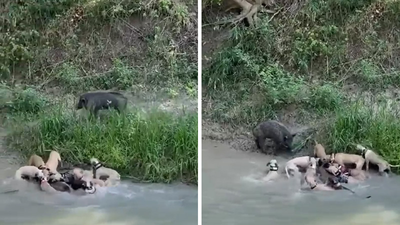 Resulta sorprendente el proceder de este cochino al ver cómo su compañero de andanzas ha sido agarrado por varios perros de caza en un caudal de agua. No se trata de una hembra con crías, ni de un gran macho acompañado de su escudero.