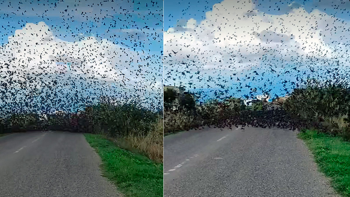 Los conductores reducen la velocidad e incluso detienen sus vehículos para grabar el espectáculo que brindan los miles de estorninos que se han posado en el asfalto.