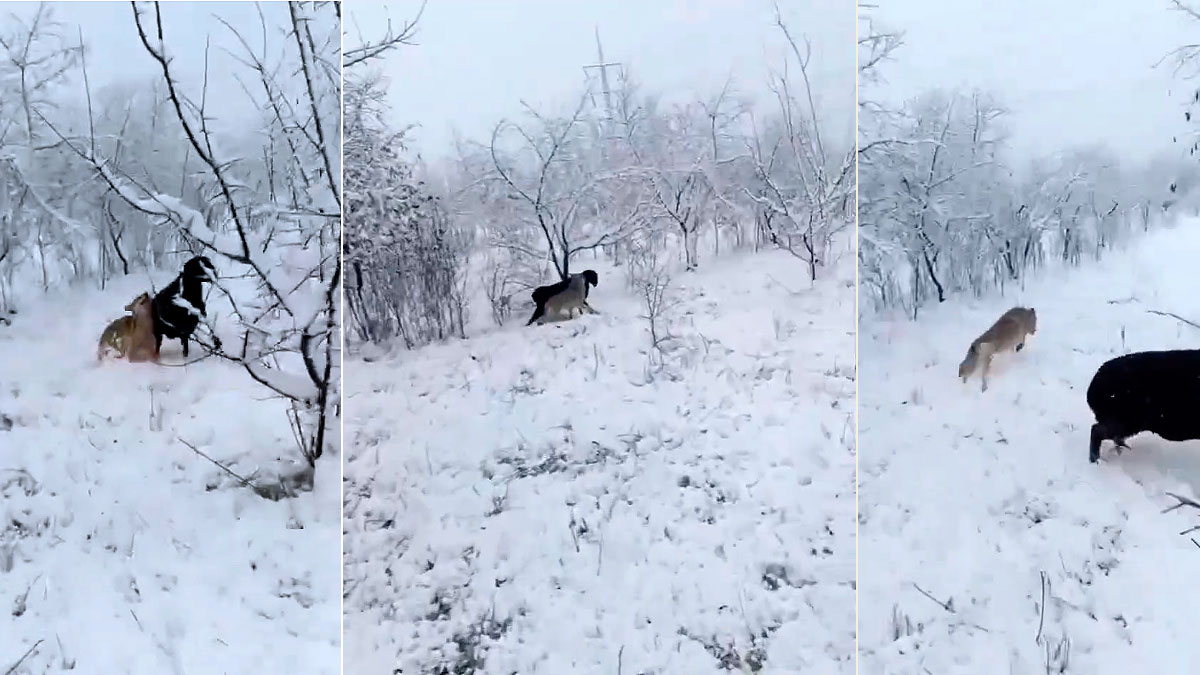 Un pastor corre para salvar a su oveja, atacada por un lobo
