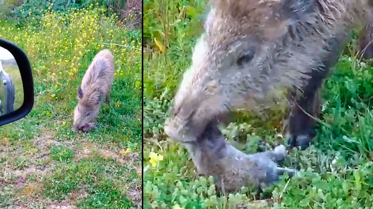 Un jabalí devora un conejo sin importarle que le graben de cerca