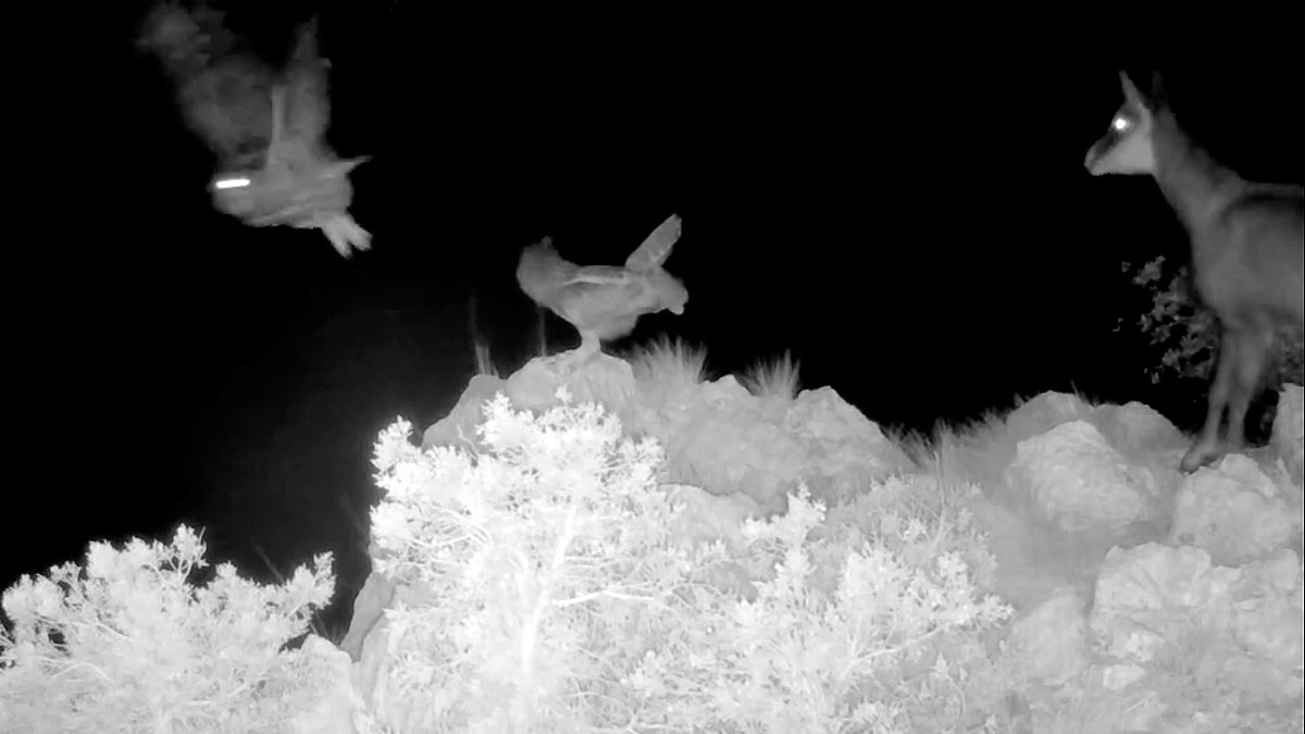 Una cámara de fototrampeo ha conseguido registrar una insólita escena en la que dos búhos reales están demasiado cerca de una hembra de rebeco y de su cría. Hasta que la madre decide enfrentarse al posible peligro para proteger a su prole.