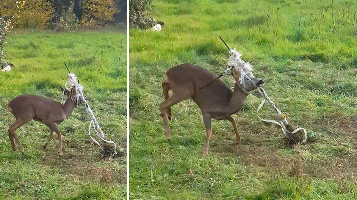 Los propios Guardas de Medio Ambiente de Navarra que le han salvado la vida al corzo han publicado el vídeo del cérvido desesperado por haber quedado enredado en los hilos del pastor eléctrico. En esos intentos de liberarse, el animal complicaba más y más su situación hasta el punto de haber enmarañado totalmente esos cables entre las puntas de sus cuernas.