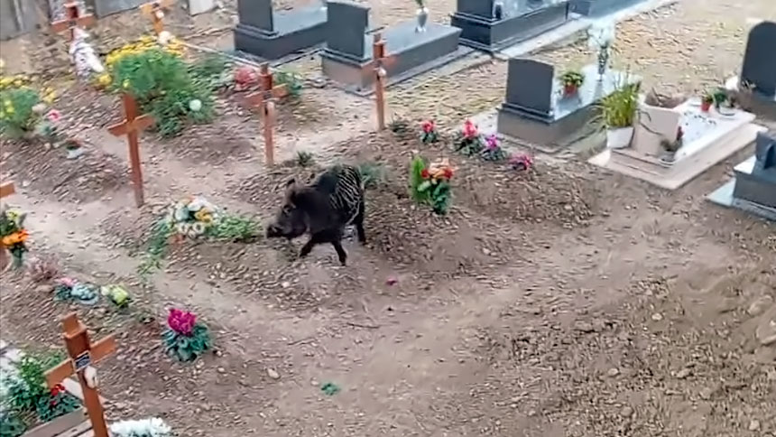 Los trabajadores del camposanto de Radicondoli, en Italia, no se explican cómo pudo entrar allí este jabalí. Y han explicado que tuvieron que esforzarse para ayudar a un jabalí que entró en el cementerio y no era capaz de salir de allí. El animal causó algunos desperfectos en las tumbas del recinto al buscar la salida y no encontrarla, pasando por encima de algunos sepulcros.